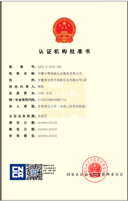 安徽中青檢驗認證服務有限公司成立于2017年6月6日,2018年1月3日通過國家認證認可監督管理委員會批準,現認證領域:質量管理體系、環境管理體系、職業健康安全管理體系、食品安全管理體系、HACCP管理體系、有機產品認證、良好農業規范、服務體系、醫療器械質量管理體系、企業誠信管理體系、食品工業企業誠信管理體系、食安安徽品牌等類別認證。